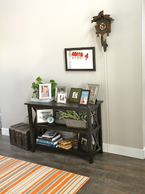 I am still on the hunt for a tall bookcase to go where you see the trunk. When I find one I will move trunk over underneath the coo coo clock. The trunk and coo coo clock were my grandma's and great-grandma's. We have tried really hard to incorporate touches from all sides of our family and are thankful we have items in our home from each of them.